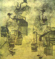 元代書畫家趙孟俯的《斗茶圖》,是一幅充滿生活氣息的風(fēng)俗畫。畫面有四個人物,身邊放著幾副盛有茶具的茶擔(dān)。左前一人,足穿草鞋,一手持茶杯,一手提茶桶,坦胸露臂,似在夸耀自己的茶質(zhì)香美。身后一人雙袖卷起,一手持杯,一手提壺,正將茶水注入杯中。右旁站立兩人,雙目凝視,似在傾聽對方介紹茶的特色,準(zhǔn)備回?fù)簟D中,人物生動,布局嚴(yán)謹(jǐn)。人物模樣,不似文人墨客,而像走街串巷的貨郎,這說明當(dāng)時斗茶已深人民間。