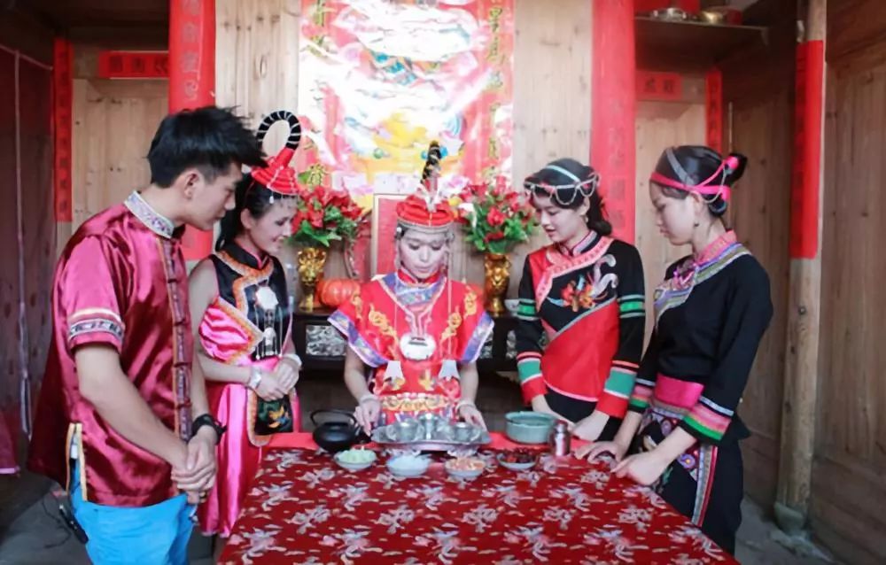 寶塔茶 畬族“寶塔茶”是福建福安畬族同胞在長期的生產(chǎn)生活中形成的一種獨(dú)具特色的婚嫁習(xí)俗。“寶塔茶”文化說的是,男方送來的禮品要一一擺在桌上展示。女方會(huì)取豬肉、禽蛋等過秤,男方一語雙關(guān)地問道:“親家嫂,有稱(有親)無?”親家嫂連聲答道:“有稱(有親)!有稱(有親)!”接著,女方用樟木紅漆八角茶盤捧出5碗熱茶,這5碗熱茶像疊羅漢式疊成3層:一碗墊底,中間3碗,圍成梅花狀,頂上再壓一碗,呈寶塔形,恭恭敬敬地獻(xiàn)給代表男方的“親家伯”品飲。親家伯品飲時(shí)用牙齒咬住寶塔頂上的那碗茶,以雙手挾住中間那3碗茶,連同底層的那碗茶,分別遞給4位轎夫,他自己則一口飲干咬著的那碗熱茶。這簡直是高難度的雜技表演!要是把茶水濺了或倒了,不但大伙無茶喝,還會(huì)遭到“親家嫂”的奚落。在獻(xiàn)茶時(shí),通常還有一段對歌習(xí)俗。