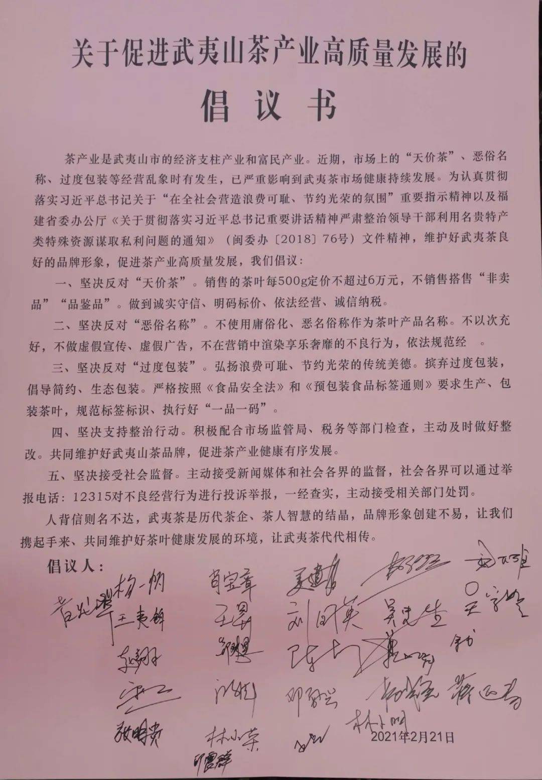 2月21日下午,武夷山市召開促進(jìn)茶葉市場健康發(fā)展推進(jìn)會,26家曾出現(xiàn)在網(wǎng)傳“天價茶”榜單上的武夷山茶企負(fù)責(zé)人共同簽署《關(guān)于促進(jìn)武夷山茶產(chǎn)業(yè)高質(zhì)量發(fā)展的倡議書》,堅決反對“天價茶”,堅決反對“惡俗名稱”、“過度包裝”,承諾不做虛假宣傳,規(guī)范經(jīng)營管理,不銷售“非賣品”“品鑒品”,自覺接受監(jiān)督,如有違法違規(guī)行為,一經(jīng)查實,主動接受相關(guān)部門處罰。