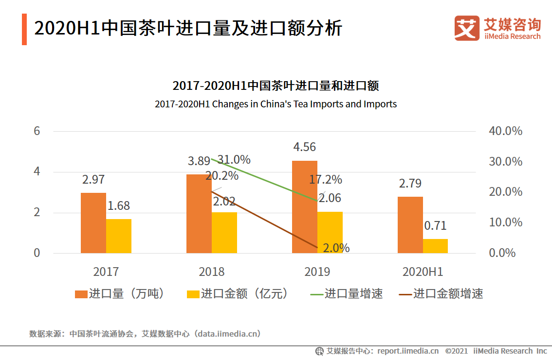 從進(jìn)口情況來看,2019年,中國茶葉進(jìn)口數(shù)量較上一年增長(zhǎng)17.2%至4.56萬噸;茶葉進(jìn)口金額較一年增加2.0%至2.06億元。2020年上半年,中國茶葉進(jìn)口量和進(jìn)口金額分別為2.79萬噸和0.71億元。