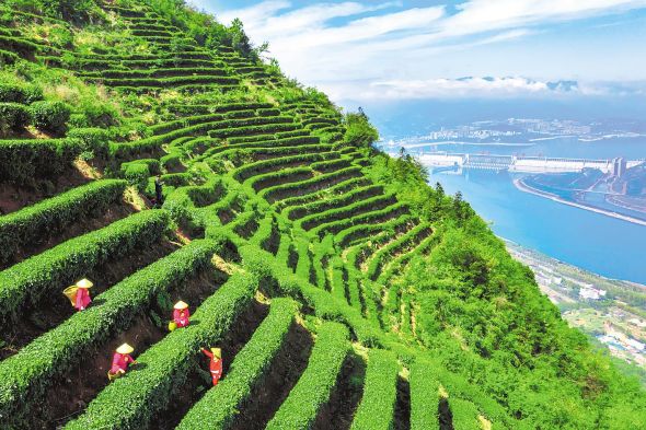 宜昌市夷陵區(qū)三斗坪鎮(zhèn)黃牛巖農(nóng)民利用梯田建設(shè)青云頂茶山小鎮(zhèn),發(fā)展農(nóng)旅融合產(chǎn)業(yè),讓游客體驗(yàn)茶文化、觀賞大壩勝景。(湖北日報(bào)全媒記者 陳勇 攝)