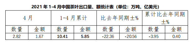 2021年1-4月,中國茶葉累計出口量為 10.41萬噸,同比減少3.95%,出口額為5.85億美元,同比增長0.40%,1-4月出口均價為5.62美元/千克,比去年同期上漲4.54%。