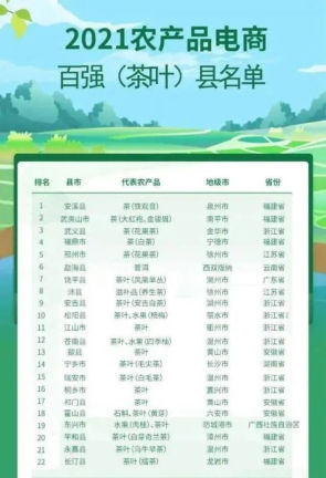 日前,農(nóng)業(yè)農(nóng)村部管理干部學(xué)院、阿里研究院聯(lián)合發(fā)布《農(nóng)產(chǎn)品電商出村進城研究:以阿里平臺為例》報告和2021農(nóng)產(chǎn)品電商百強縣名單,其中茶葉類縣市22個入選,廣東省饒平縣是廣東省唯一上榜縣市。