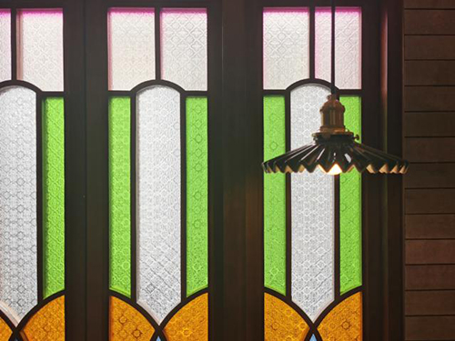 滿洲窗是嶺南建筑的一個(gè)重要符號(hào),彩色玻璃篩取入室光線,同時(shí)窗格演變?yōu)檠b飾紋樣,透過海棠花玻璃,物體的輪廓逐漸消散,斑駁迷離而絢麗散碎。